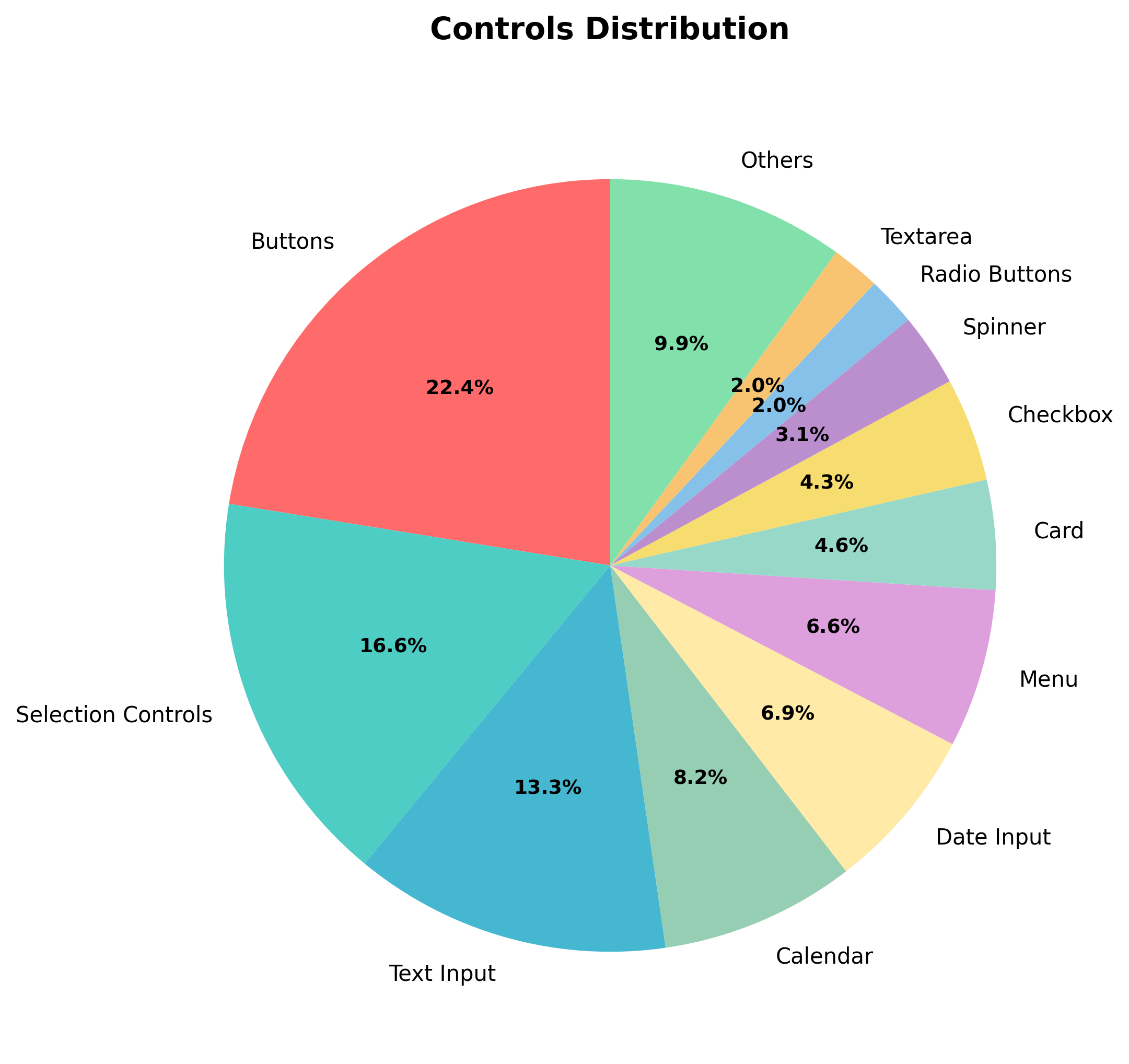 Control distribution emphasizes interactive elements: buttons (22.4%), selection controls (16.5%), text inputs (13.2%), and menus (6.6%). Calendar (8.1%) and date input controls (6.8%) together receive notable coverage due to their temporal complexity across 20 distinct implementations including analog clocks and timezone-aware selections.